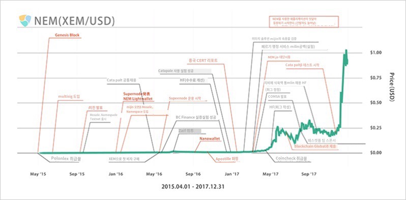 2017년에 들어가자 중국 CERT보고서가 공개됩니다. 이 보고서는 NEM이 가장 안전한 프로젝트로 평가하고 있습니다. 2017년부터 NEM블록체인을 이용한 애플리케이션 개발이 속속 진행되어 개발과 동시에 NEM가 퍼지고 가격도 상승하고 있습니다.